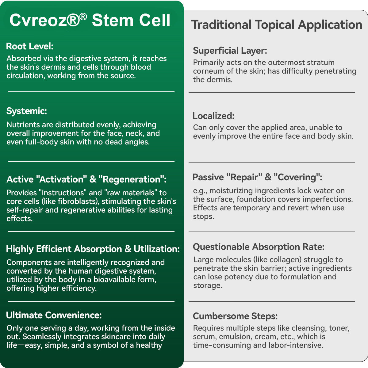 ✅ Rapid absorption: This fast-acting liquid formula can directly deliver the core ingredient Stem cell to the cells, with a mild but significant effect, especially suitable for those with digestive system sensitivity.